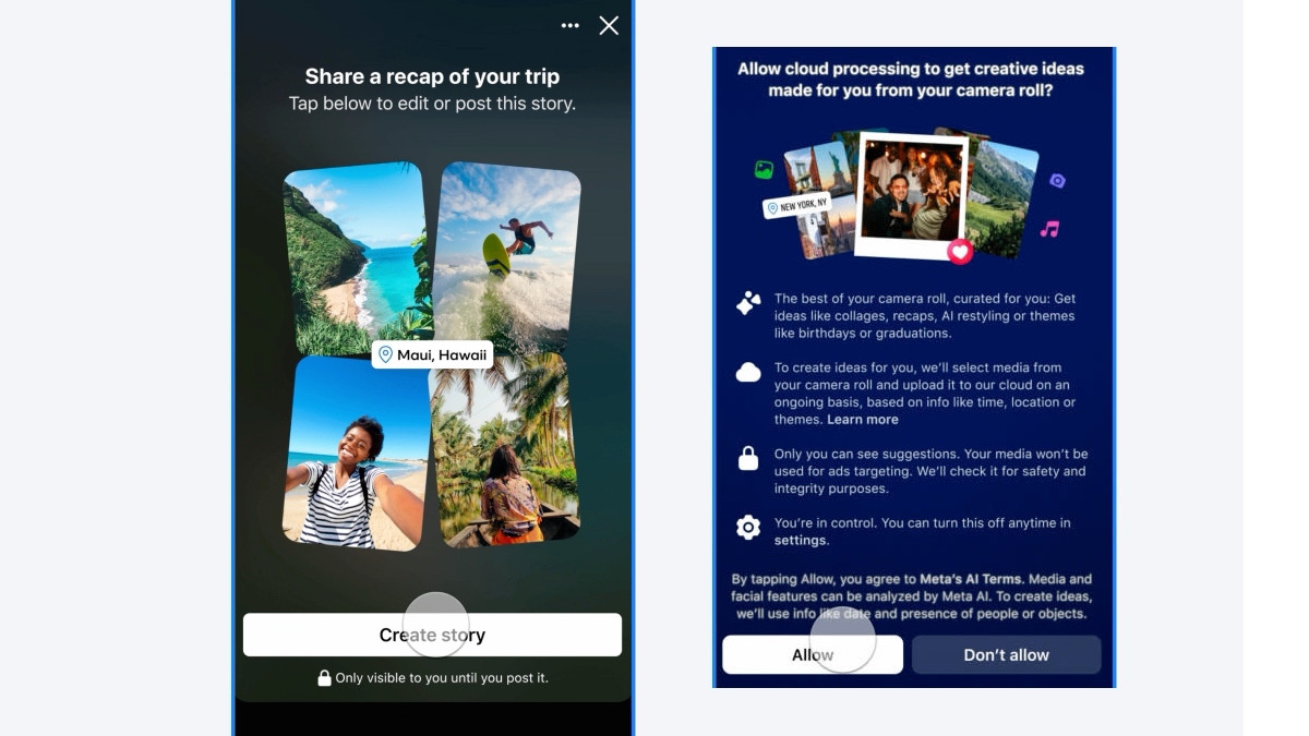Önerilerin yalnızca kullanıcıya özel olduğunu söyleyen Meta, fikir oluşturmak için galerideki görsellerin seçilip buluta yükleneceğini söyledi. Bu seçimler zaman, konum veya tema gibi bilgilere göre yapılacak. Şirket ayrıca bu verilerin hedefli reklamcılık için kullanılmayacağını da sözlerine ekledi.