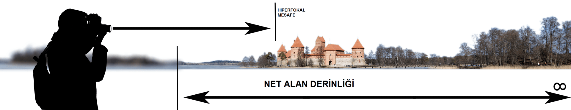 Fotoğraf çekmek için kadraj oluşturduktan sonra ayarlara göre netleme mesafesi bize belli bir büyüklükte Alan Derinliği sunar. Bu netleme düzlemi genel olarak önde 1/3’lük kısım yer alır. Kadrajın arka kısmı ise 2/3’lük kısım netleme düzleminin arkasında kalır. Tam olarak olmasa da kabul görmüş olan oranlar bunlardır. Diyelim ki netleme sonsuza ayarlandı. Bu ayarda bile belli bir alan derinliği elde edilebilir. Sonsuzdan makineye doğru yaklaşarak gelindiğinde en net noktanın bulunduğu yer hiperfokal mesafeyi gösterir.