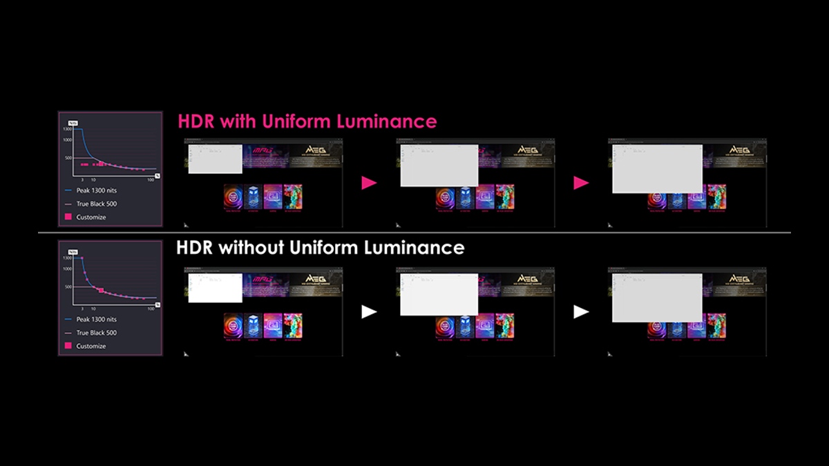 MSI, Uniform Luminance işlevi sayesinde parlaklığı eşit şekilde dağıtıyor ve kullanıcılara HDR deneyimlerini en ince ayrıntısına kadar kişiselleştirme şansı tanıyor. İçerik üreticileri ile oyunculara hitap eden bu özellik, 14 farklı noktadan müdahale ederek HDR parlaklık eğrisini özgürce yapılandırmayı mümkün kılıyor.